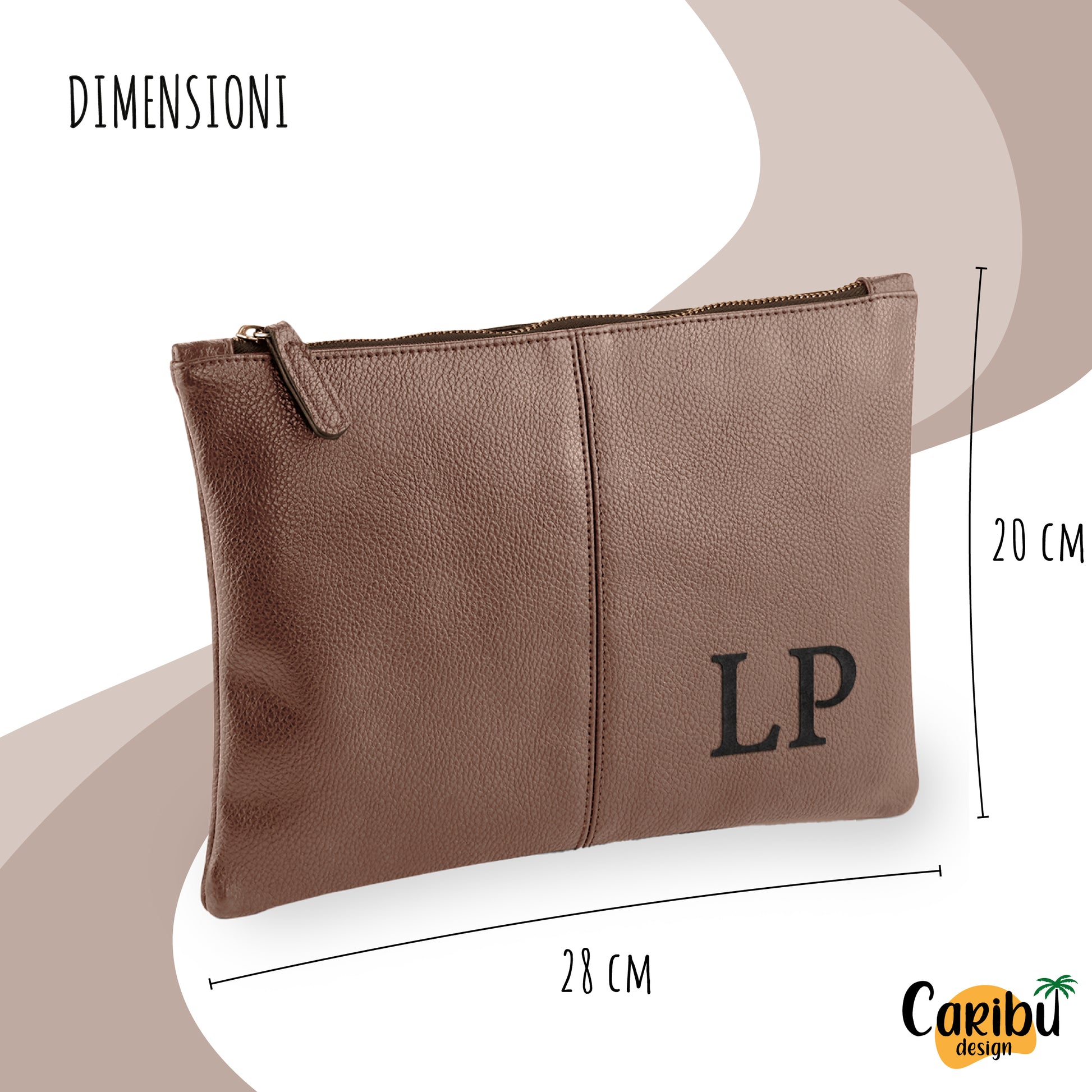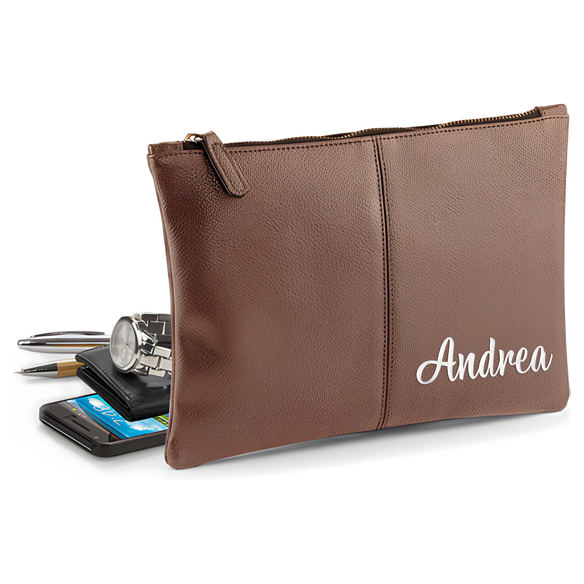 Busta da uomo a mano in ecopelle morbida e resistente, personalizzabile con nome, iniziali o testo. Una pochette dal design elegante e raffinato, con dimensioni 28x20 cm, ideale per portare con sè chiavi, telefono, mini tablet, documenti, soldi contanti, cavi e piccola elettronica, ma anche essenziali da toilette come spazzolino, dentifricio, rasoio, profumo etc.
