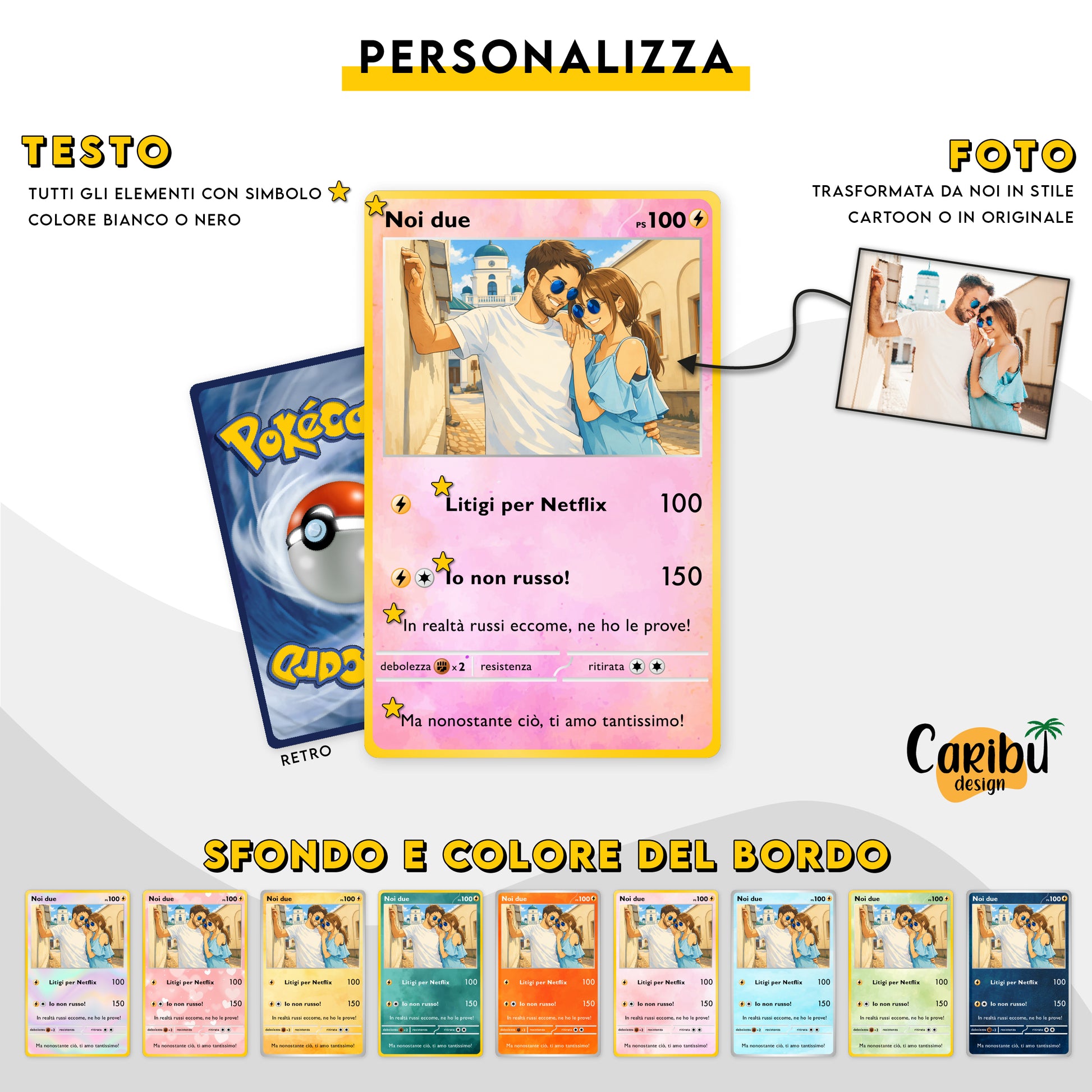 • CARTA POKE PERSONALIZZATA CON FOTO E TESTO: crea la tua poke card personalizzabile con foto (trasformata in stile cartoon o originale) e testi (nomi, dedica, frase, data). Puoi scegliere anche lo sfondo e il colore del bordo. Retro stampato con sfondo in stile poke.