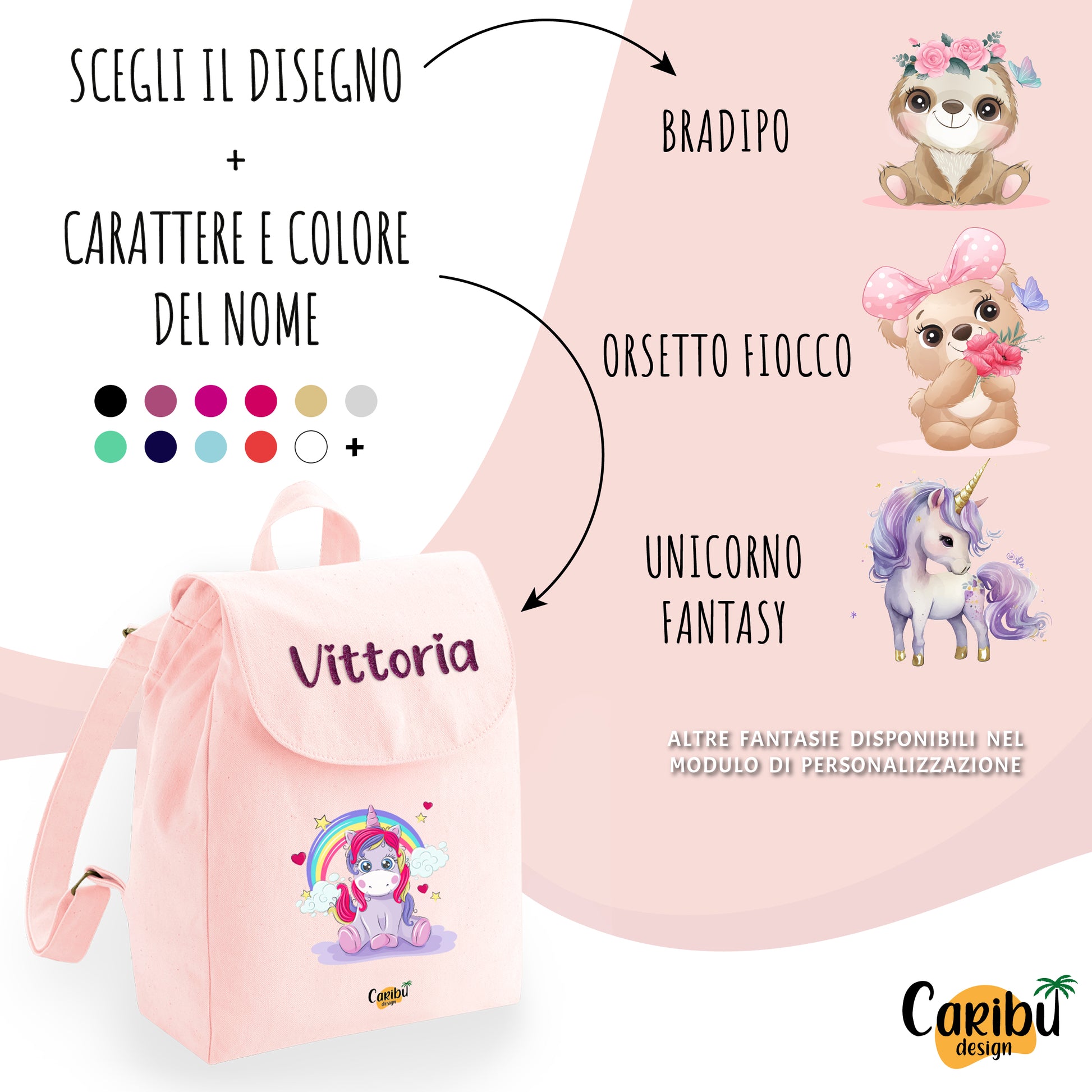 • Meteriale: lo zaino è realizzato in 100% cotone organico, particolarmente adatto allo scopo grazie alla grammatura 340 g/m² che lo rende resistente, duraturo e leggero, per non appesantire la schiena del bambino. Il nome personalizzato è disponibile in vari colori sia in velluto che in glitter.